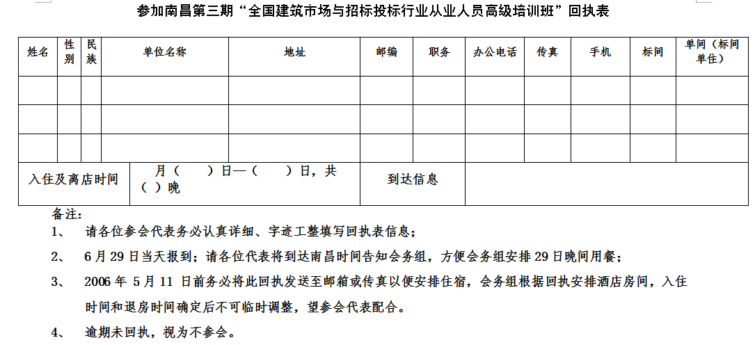 請參加人員務必于2016年6月23日前將回執(zhí)表以傳真或電子郵件形式發(fā)送到會務組。并須將參會人員信息報備內工建協(xié)。